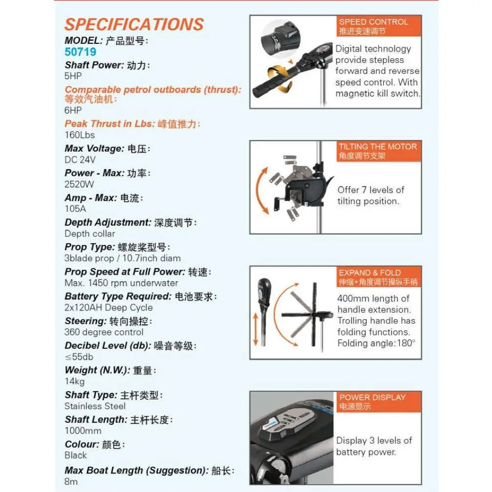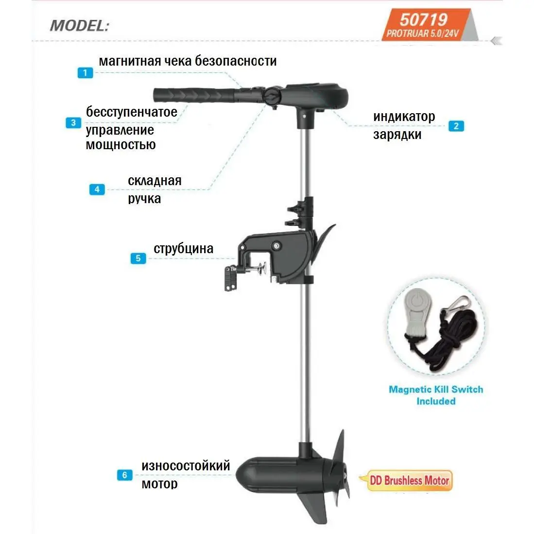 Комплектація | гвинт 3-х лопатевий 1 шт., електромотор 1 шт., інструкція 1 шт., кабель другого акумулятора 1 шт., картонна упаковка 1 шт., кіль мотора 1 шт., ключ для встановлення/зняття гвинта 1 шт., монтажний комплект 1 шт., чека безпеки 1 шт. |